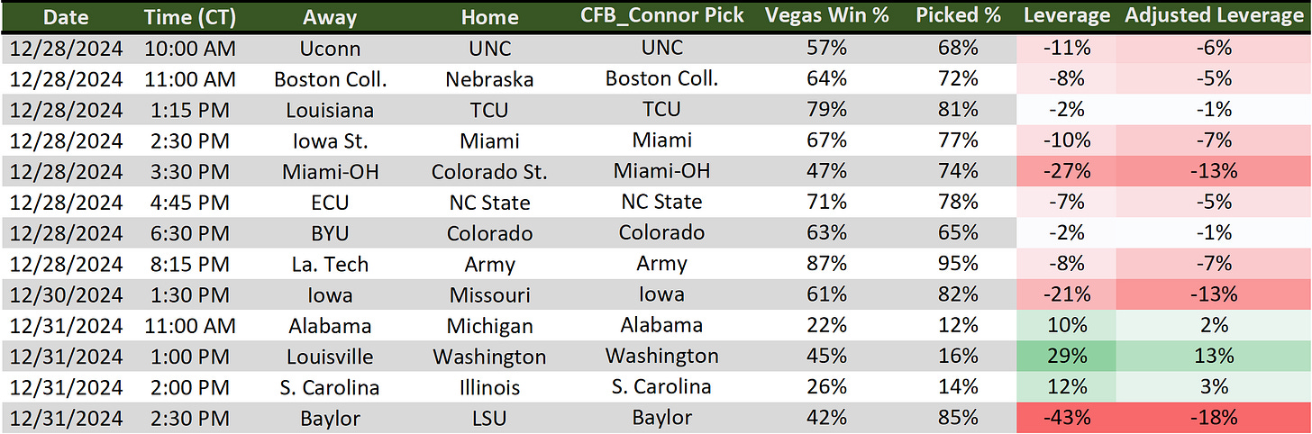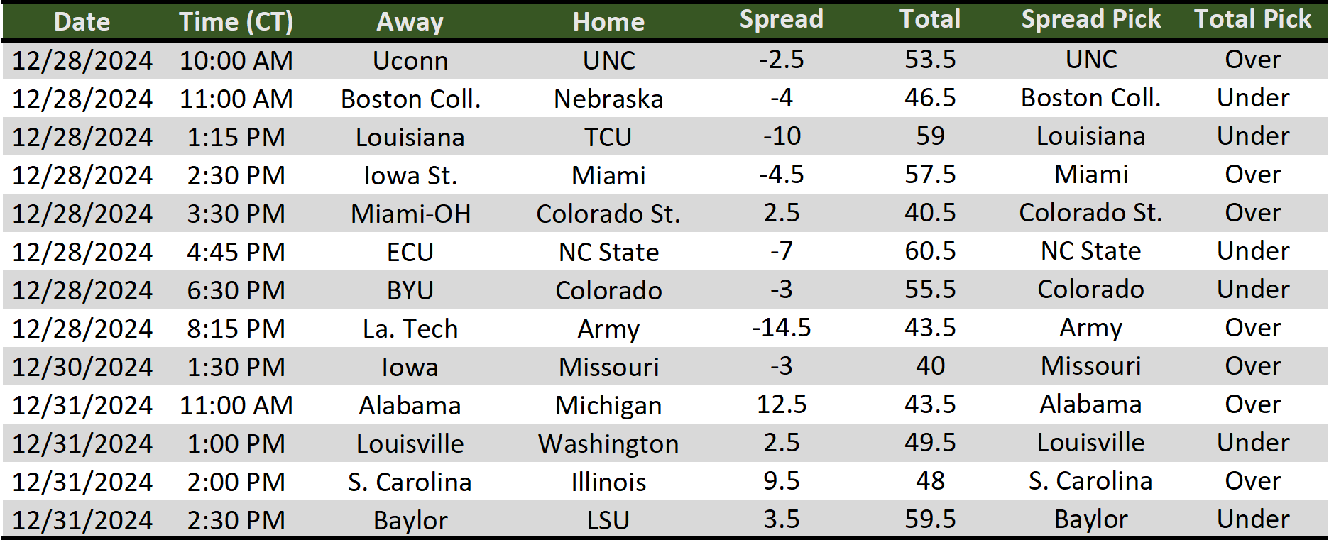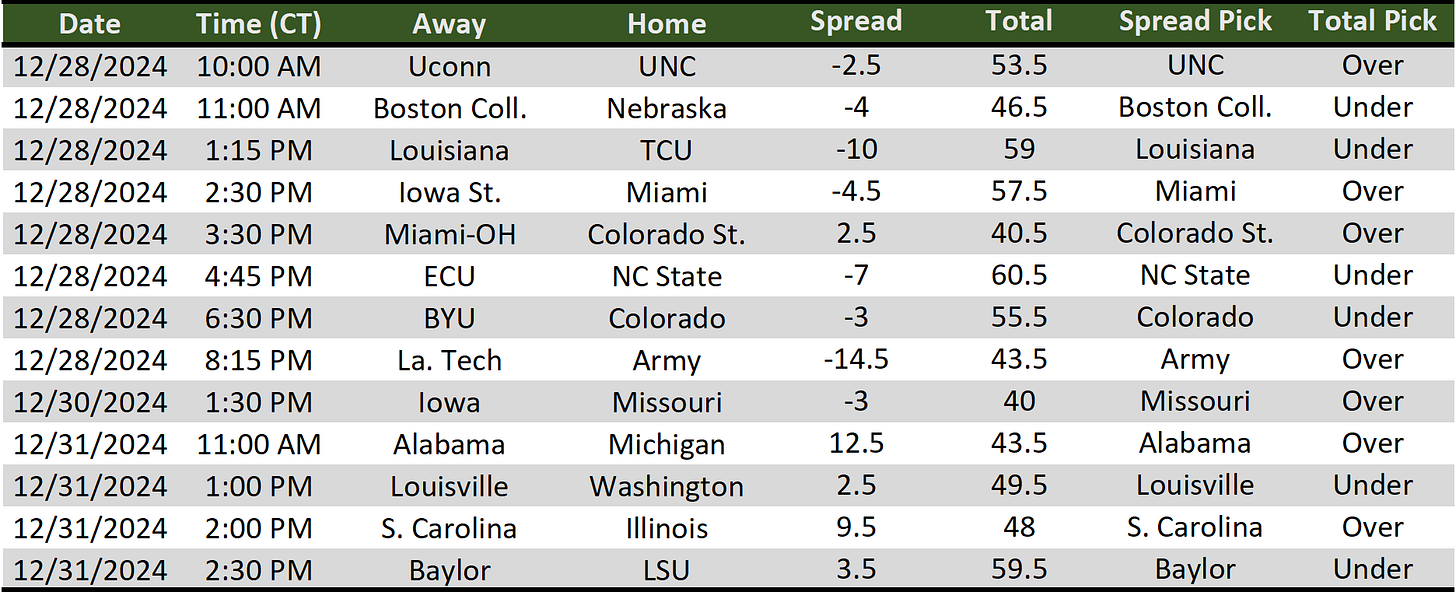 Back with the remaining bowl games leading up to the second round of the College Football Playoff. Bowl season has been steadily improving in watchability, even if the quality of football has left a lot to be desired. There are only 24 games remaining in the 2024 college football season, so all football is good football at this point in the season. Be on the lookout for my round 2 CFP picks on New Year’s Eve in the lead up to the kickoff of the Penn State/Boise State game.